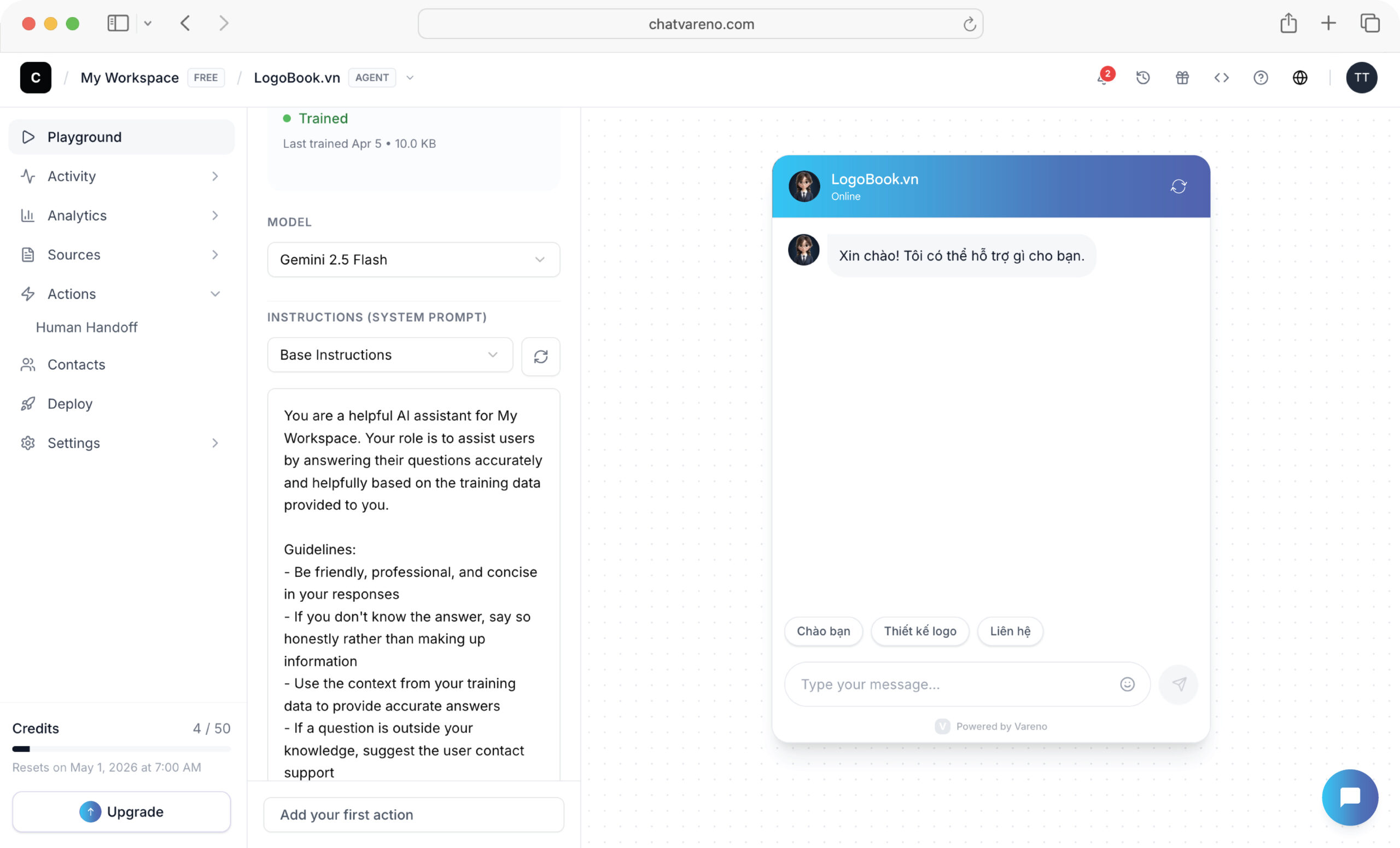 Huấn luyện AI từ dữ liệu riêng của bạn — Website, PDF, Q&A. Triển khai lên Website, Zalo OA, Messenger và nhiều nền tảng khác. AI tự động trả lời khách 24/7. Thông báo cho admin khi cần hỗ trợ tư vấn, đảm bảo tăng tỉ lệ chốt đơn, doanh thu.